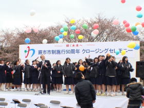 -輝く未来へ-を合言葉に記念フラッグの紹介そして、バルーンリリース・蕨東中学校吹奏楽部による演奏です。